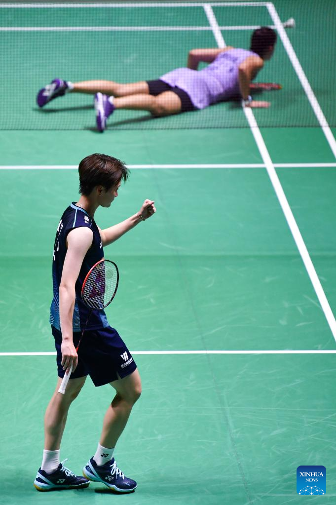 Chen Yufei (bottom) of China reacts during the women's singles final against Carolina Marin of Spain at 2023 Indonesia Open badminton tournament in Jakarta, Indonesia, June 18, 2023. (Xinhua/Xu Qin)