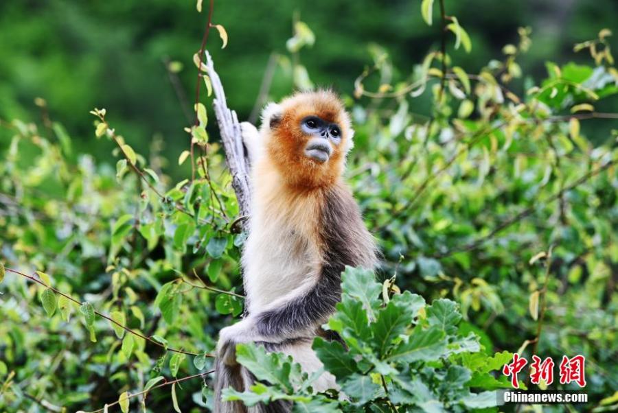 A golden snub-nosed monkey rests on a tree at Baihe National Nature Reserve in Jiuzhaigou County, Aba Prefecture, southwest China's Sichuan Province, June 17, 2023. (Photo: China News Service/An Yuan)