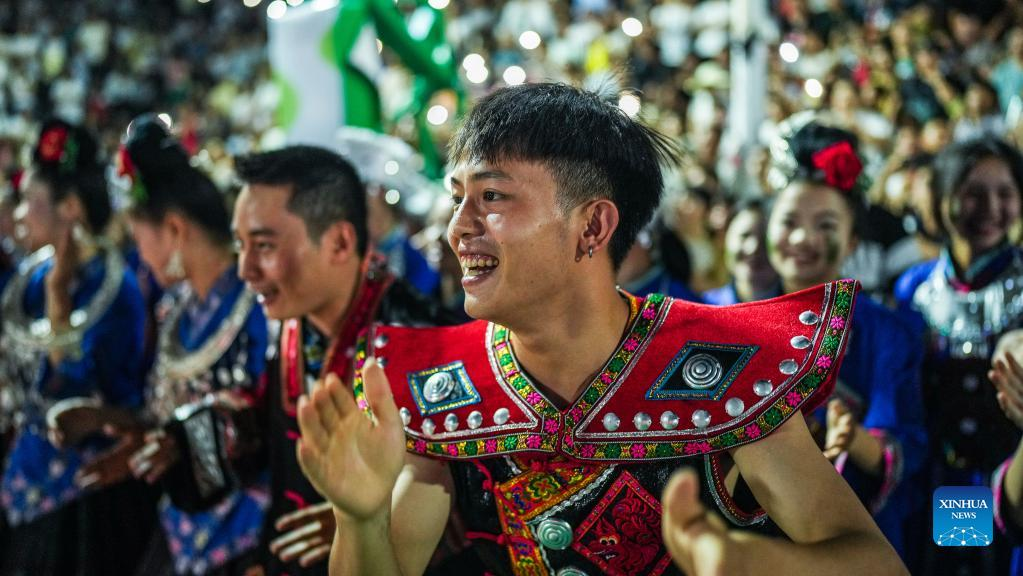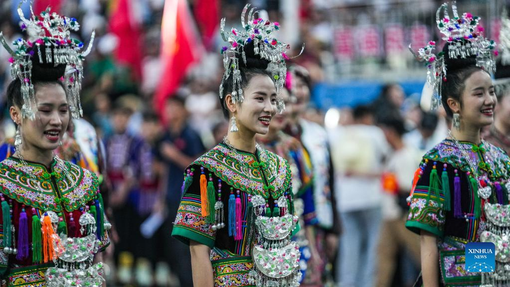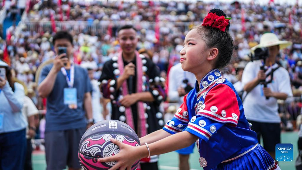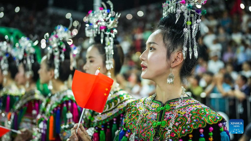 Villagers perform at the unveiling ceremony of the China's Village Basketball Competition in Taipan Village, Taijiang County, southwest China's Guizhou Province, June 20, 2023. China's Village Basketball Competition was launched with a match between Team Qiandongnan Miao and Dong Autonomous Prefecture and Team Linxia Hui Autonomous Prefecture in Taipan Village on Tuesday. (Xinhua/Tao Liang)