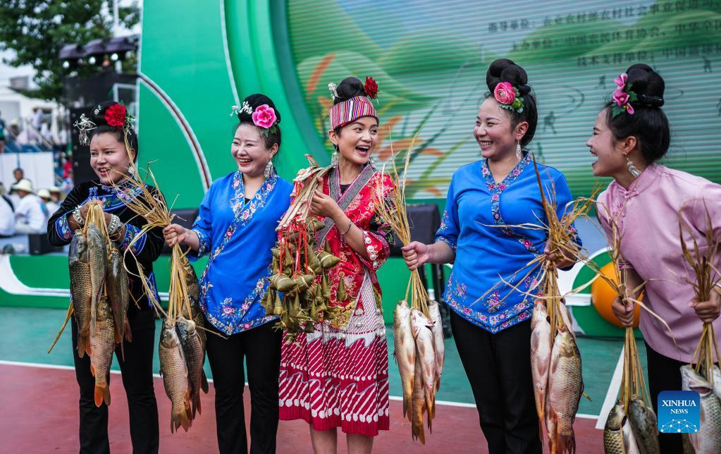 Villagers shows the prizes of the shooting contest before the unveiling ceremony of the China's Village Basketball Competition in Taipan Village, Taijiang County, southwest China's Guizhou Province, June 20, 2023. China's Village Basketball Competition was launched with a match between Team Qiandongnan Miao and Dong Autonomous Prefecture and Team Linxia Hui Autonomous Prefecture in Taipan Village on Tuesday. (Xinhua/Tao Liang)