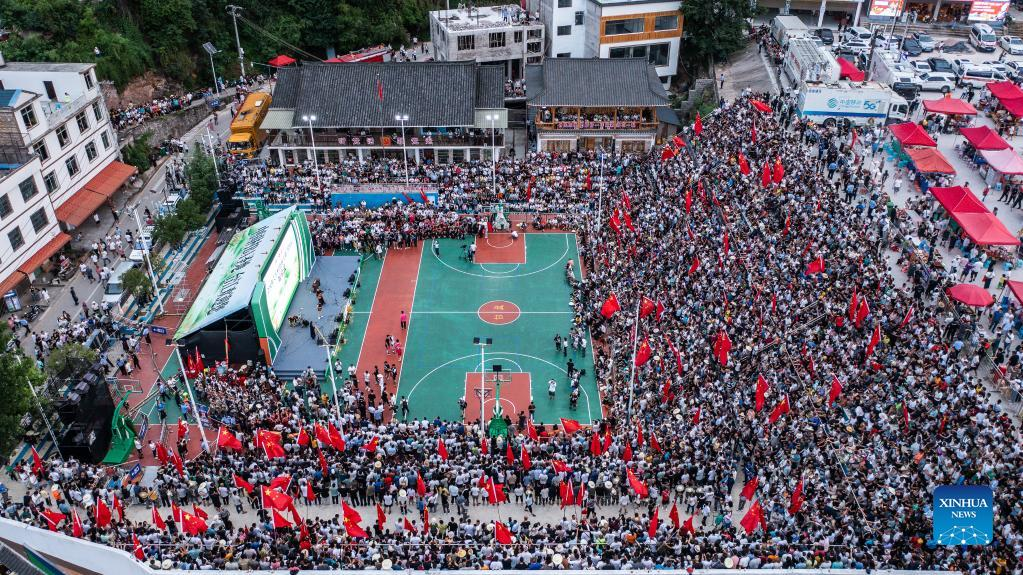 Aerial photo taken on June 20, 2023 shows spectators gathering to wait for the match to begin at the China's Village Basketball Competition in Taipan Village, Taijiang County, southwest China's Guizhou Province. China's Village Basketball Competition was launched with a match between Team Qiandongnan Miao and Dong Autonomous Prefecture and Team Linxia Hui Autonomous Prefecture in Taipan Village on Tuesday. (Xinhua/Tao Liang)