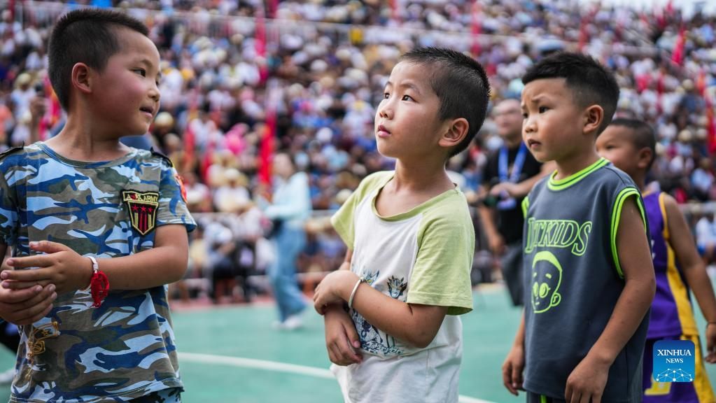 Kids line up to participate in a shooting contest before the unveiling ceremony of the China's Village Basketball Competition in Taipan Village, Taijiang County, southwest China's Guizhou Province, June 20, 2023. China's Village Basketball Competition was launched with a match between Team Qiandongnan Miao and Dong Autonomous Prefecture and Team Linxia Hui Autonomous Prefecture in Taipan Village on Tuesday. (Xinhua/Tao Liang)
