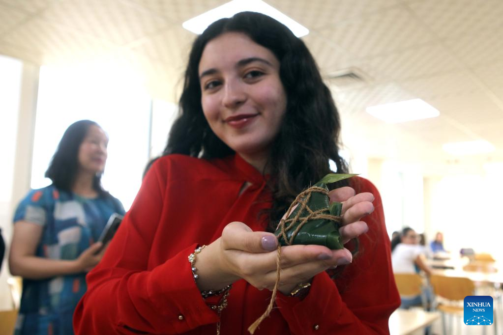Students learn to make Zongzi, a traditional Chinese food, during a celebration of Dragon Boat Festival in Amman, Jordan, on June 20, 2023. (Photo by Mohammad Abu Ghosh/Xinhua)