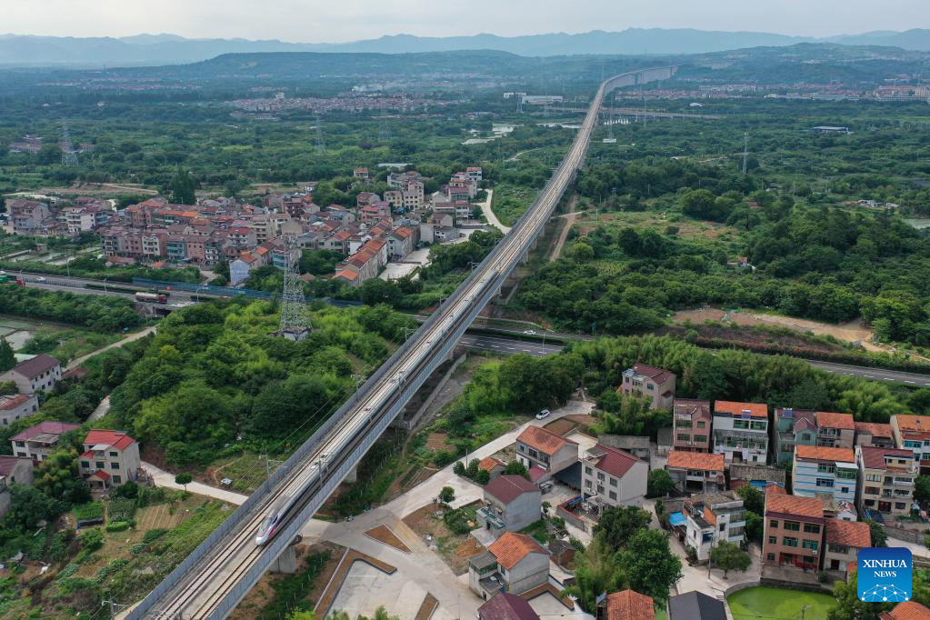 This aerial photo taken on June 19, 2023 shows a bullet train running on the Hangzhou-Shaoxing-Taizhou intercity railway in Shengzhou, east China's Zhejiang Province. (Xinhua/Huang Zongzhi)