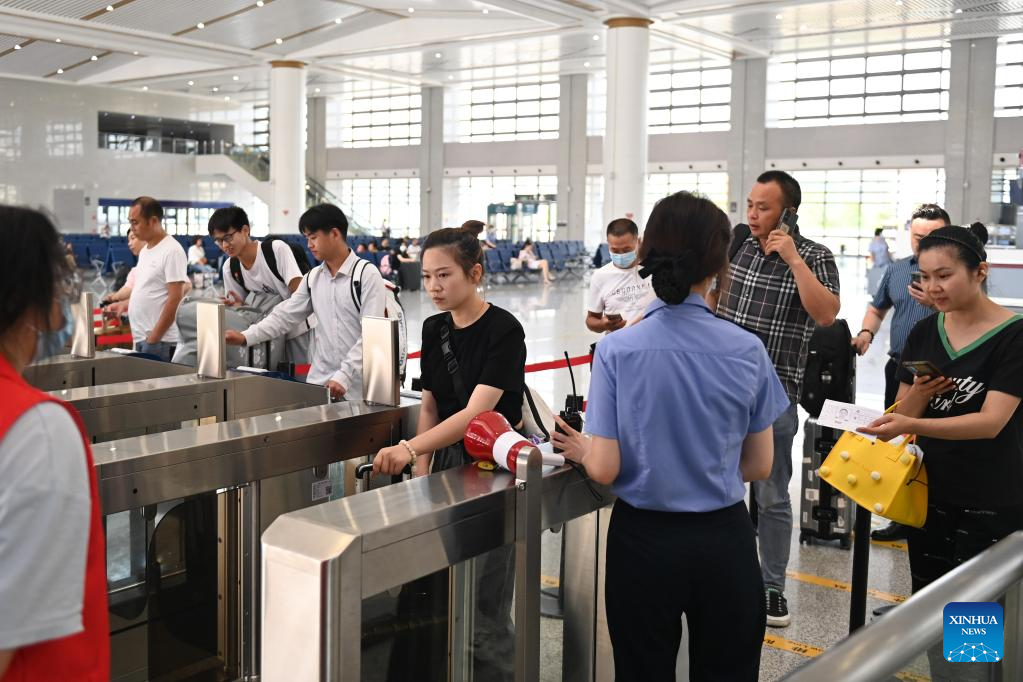 Passengers go through ticket gates at Xinchang Railway Station on the Hangzhou-Shaoxing-Taizhou intercity railway in east China's Zhejiang Province, June 19, 2023. (Xinhua/Huang Zongzhi)