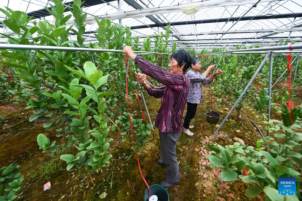 Farmers tie fingered citron plants to trellis with strings at a plantation in Beishankou Village of Chisong Town in Jindong District of Jinhua City, east China's Zhejiang Province, June 20, 2023. Based on the integration of tourism and agriculture, Jindong District has fostered a rural industrial development belt among its administrative villages with local distinctive industries. (Xinhua/Xu Yu)