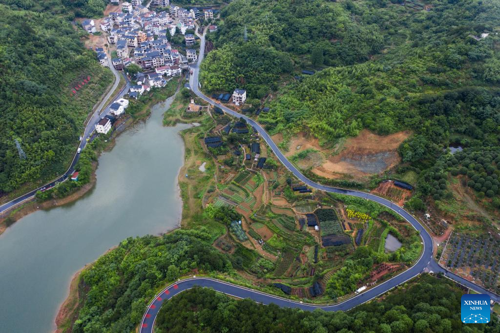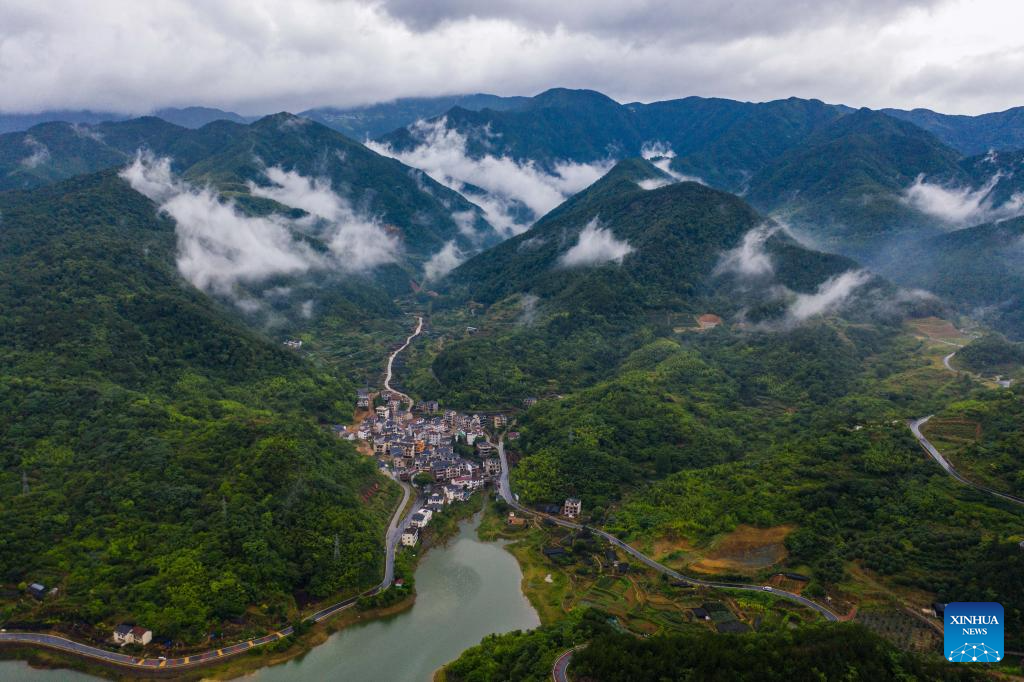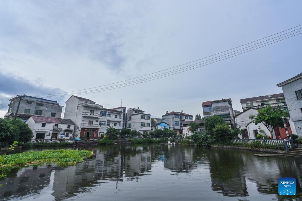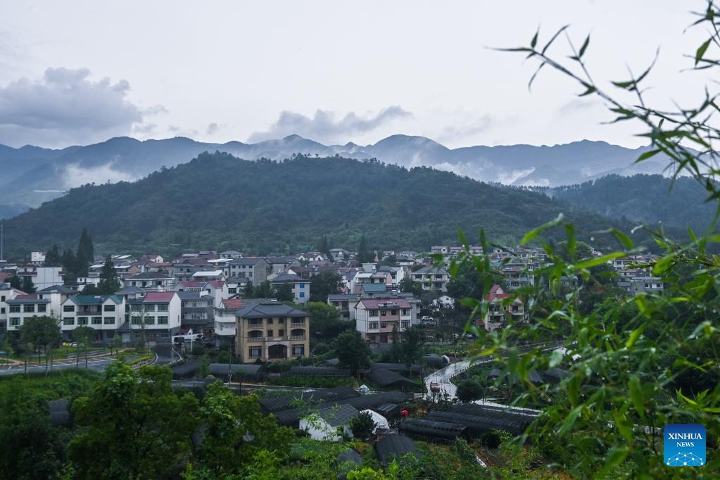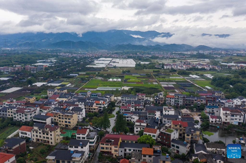This photo taken on June 20, 2023 shows a view of Beishankou Village of Chisong Town in Jindong District of Jinhua City, east China's Zhejiang Province. Based on the integration of tourism and agriculture, Jindong District has fostered a rural industrial development belt among its administrative villages with local distinctive industries. (Xinhua/Xu Yu)