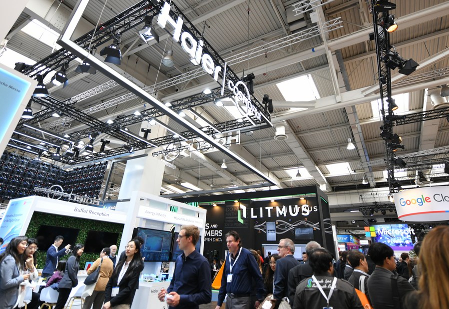 This photo taken on April 19, 2023 shows the booth of Haier's industrial internet platform COSMOPlat at Hannover Messe 2023 in Hannover, Germany, April 19, 2023. (Xinhua/Ren Pengfei)