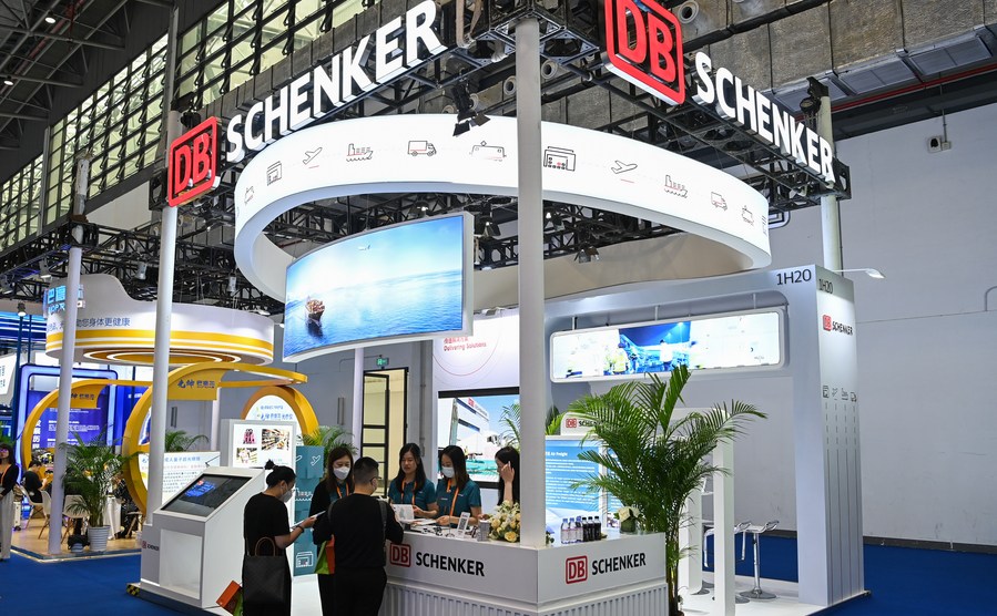This photo taken on April 13, 2023 shows the booth of DB Schenker from Germany at the third China International Consumer Products Expo (CICPE) in Haikou, south China's Hainan Province. (Xinhua/Yang Guanyu)