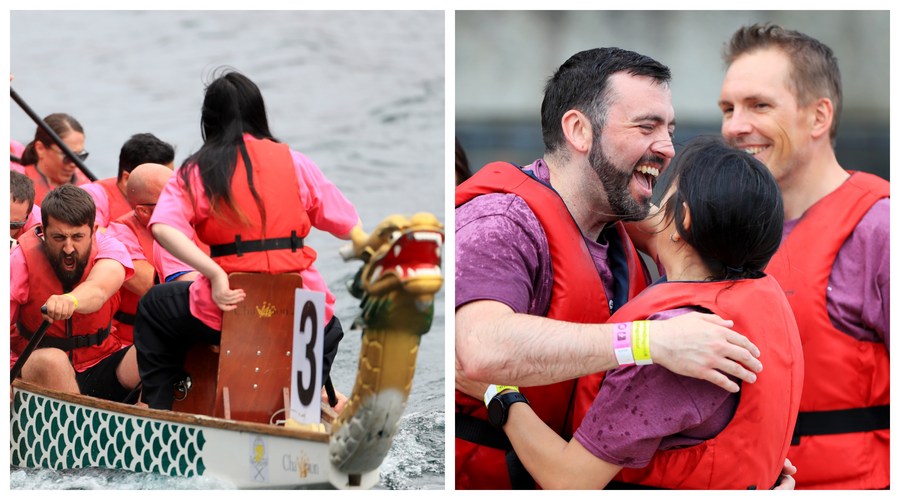 Contestants compete (left) and celebrate (right) during the 2023 UK Chinese Dragon Boat Festival in Salford, Britain, June 17, 2023. (Xinhua/Li Ying)
