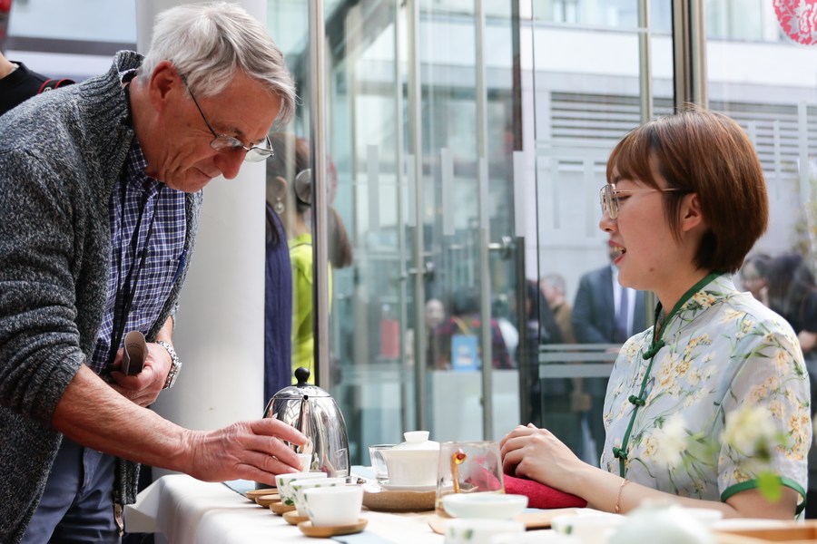 A visitor prepares to taste tea during an opening ceremony of Yaji Cultural Salon "Tea for Harmony" at China Cultural Center in Brussels, Belgium, on May 4, 2023. (Xinhua/Zheng Huansong)