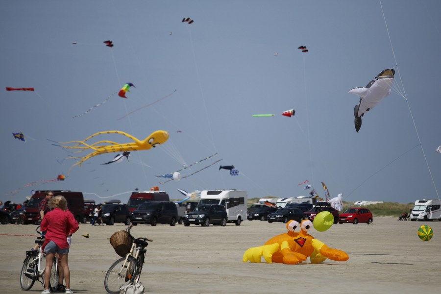 People fly kites during an international kite festival in Fanoe, Denmark, on June 13, 2023. (Xinhua/Lin Jing)