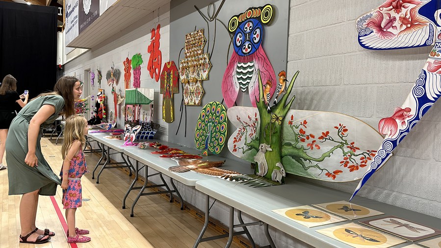 People visit a workshop showcasing traditional Chinese kites during an international kite festival in Fanoe, Denmark, on June 11, 2023. (Xinhua/Lin Jing)