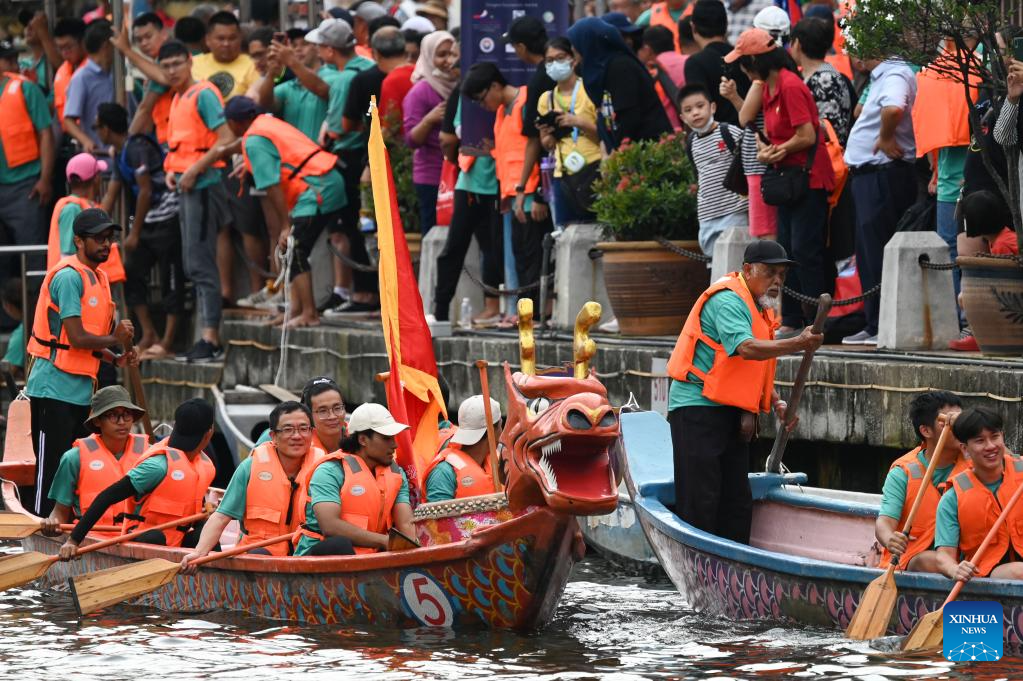People attend a dragon boat race to greet the upcoming Dragon Boat Festival in Malacca, Malaysia, June 18, 2023. Activities like Zongzi making and dragon boat race were held in Malacca to greet the upcoming Dragon Boat Festival. (Xinhua/Cheng Yiheng)