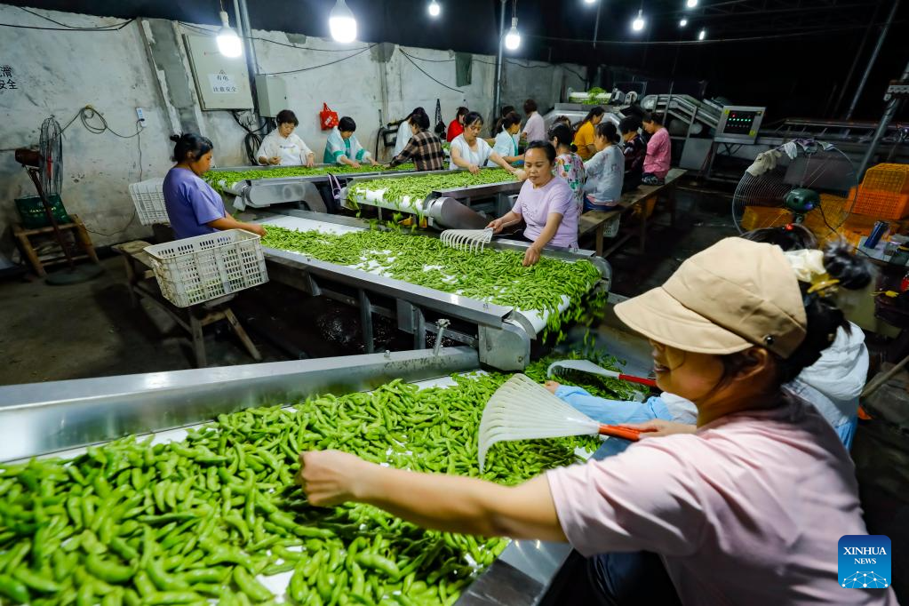 Workers select green soybean on a production line of a market in Guancang of Jintang County, Chengdu of southwest China's Sichuan Province, June 19, 2023. Guancang Community is an agricultural production center in Jintang County of Chengdu, with an annual production of green soybean of 82,000 tonnes and annual value output of 320 million yuan (about 44.57 million U.S. dollars).