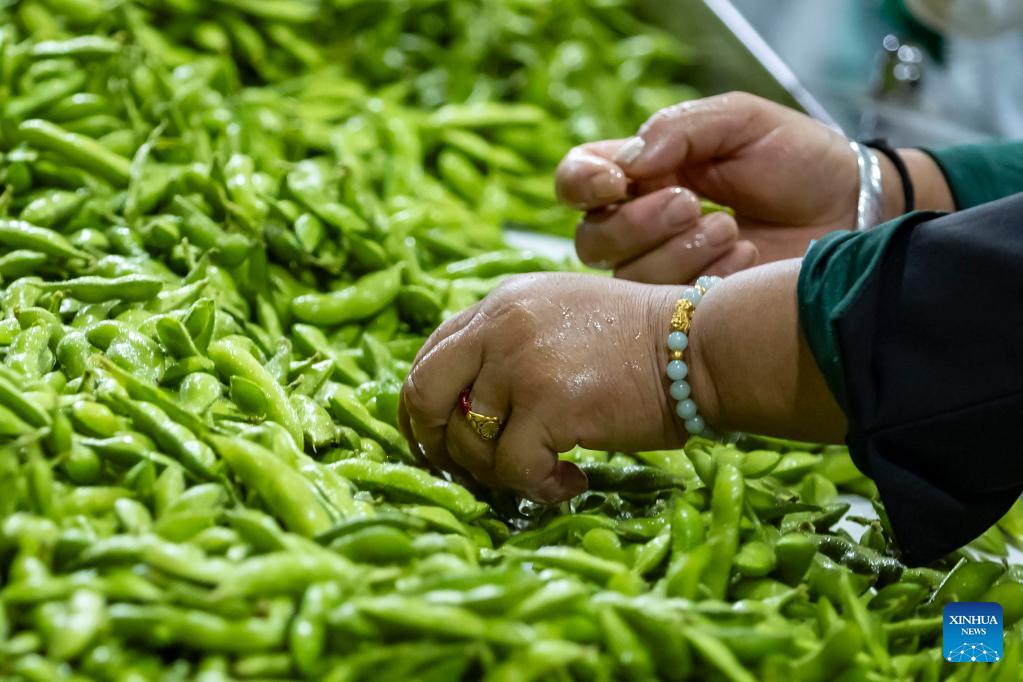 A worker selects green soybean on a production line of a market in Guancang of Jintang County, Chengdu of southwest China's Sichuan Province, June 19, 2023. Guancang Community is an agricultural production center in Jintang County of Chengdu, with an annual production of green soybean of 82,000 tonnes and annual value output of 320 million yuan (about 44.57 million U.S. dollars).