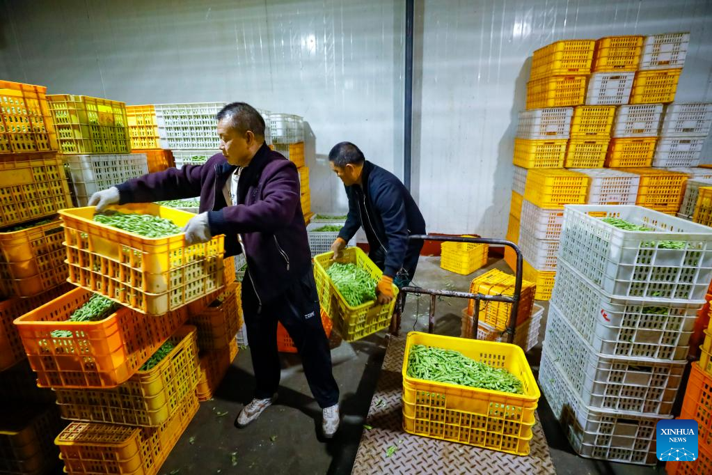 Workers carry green soybeans to store in freezers in Guancang of Jintang County, Chengdu of southwest China's Sichuan Province, June 19, 2023. Guancang Community is an agricultural production center in Jintang County of Chengdu, with an annual production of green soybean of 82,000 tonnes and annual value output of 320 million yuan (about 44.57 million U.S. dollars).
