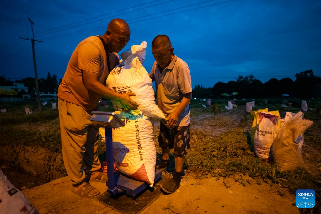 A farmer weighs green soybeans just harvested in Guancang of Jintang County, Chengdu of southwest China's Sichuan Province, June 19, 2023. Guancang Community is an agricultural production center in Jintang County of Chengdu, with an annual production of green soybean of 82,000 tonnes and annual value output of 320 million yuan (about 44.57 million U.S. dollars).