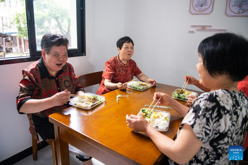 Senior residents have lunch at a day-care center for the elderly in Hanshou County of Changde City, central China's Hunan Province, June 20, 2023.