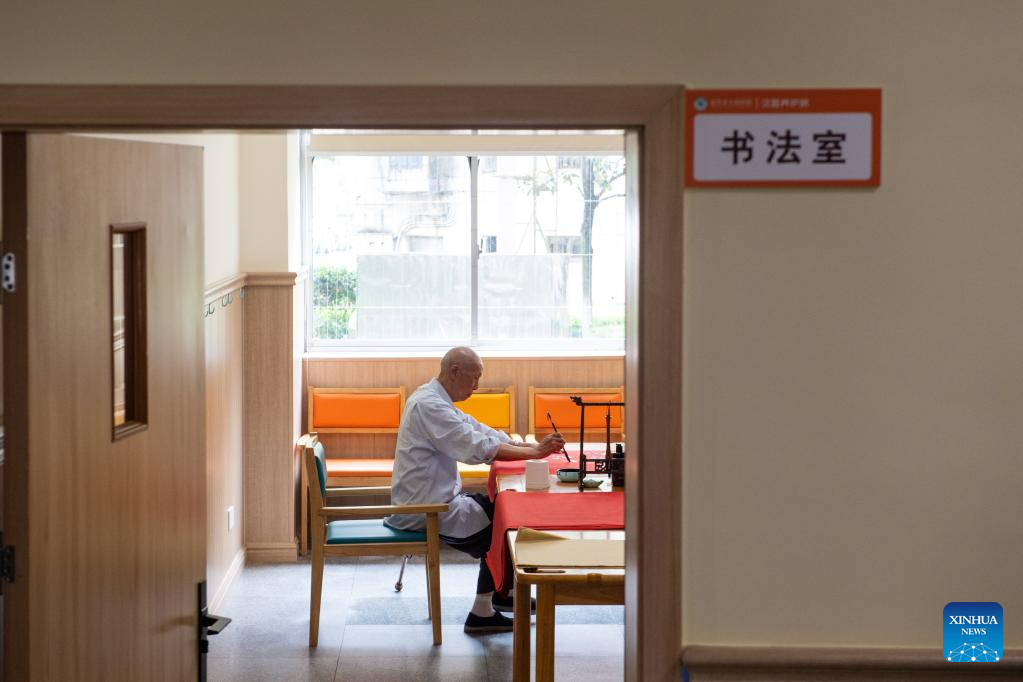 A senior resident practices calligraphy at a nursing home in Hanshou County of Changde City, central China's Hunan Province, June 20, 2023.