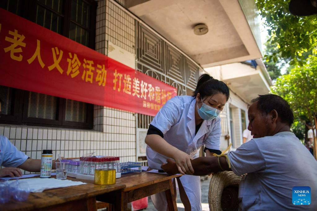 A medical worker (1st R) conducts medical examination for a senior resident at a nursing home in Anxiang County of Changde City, central China's Hunan Province, June 21, 2023.