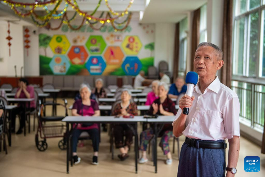 A senior resident sings at a social welfare center in Hanshou County of Changde City, central China's Hunan Province, June 20, 2023.