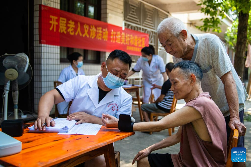 A medical worker measures blood pressure for a senior resident at a community in Anxiang County of Changde City, central China's Hunan Province, June 21, 2023.