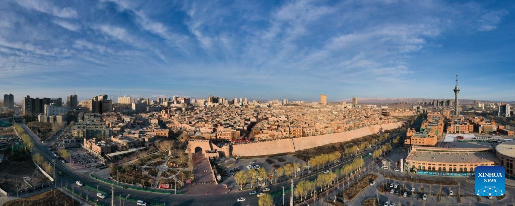 This aerial photo shows a view of the ancient city of Kashgar, northwest China's Xinjiang Uygur Autonomous Region, March 10, 2023. (Xinhua/Li Xiang)