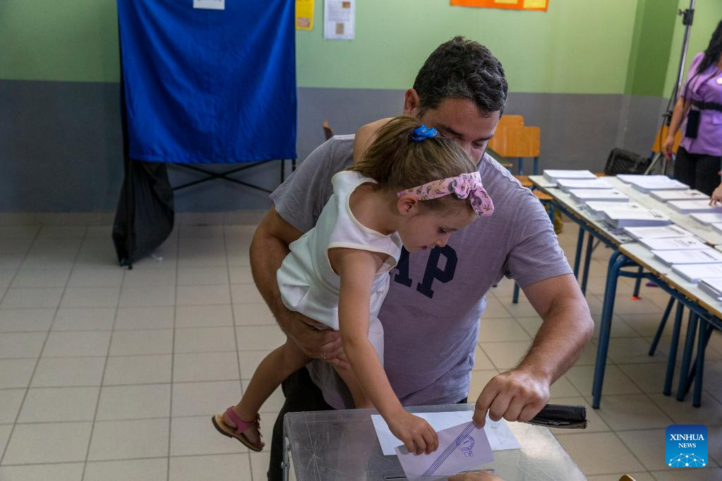 A man with a child in his arm casts his ballot at a polling station in Athens, Greece, June 25, 2023. A second general election was held in Greece on Sunday. (Photo by Marios Lolos/Xinhua)