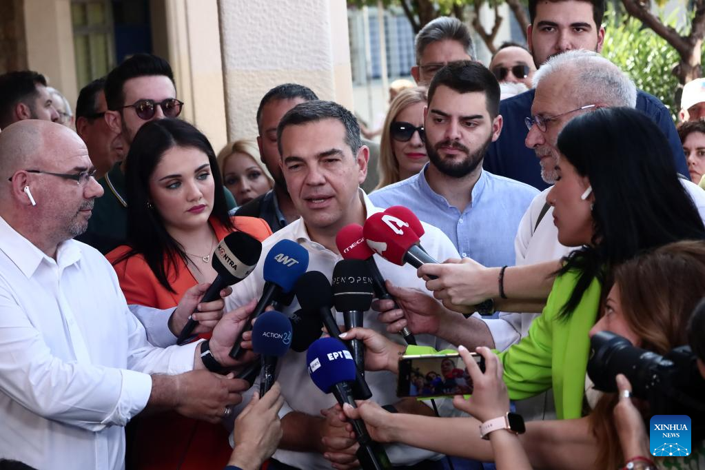 Alexis Tsipras, leader of Greece's main opposition party, SYRIZA-Progressive Alliance, speaks to the media at a polling station in Athens, Greece, June 25, 2023. A second general election was held in Greece on Sunday. (Photo by Marios Lolos/Xinhua)