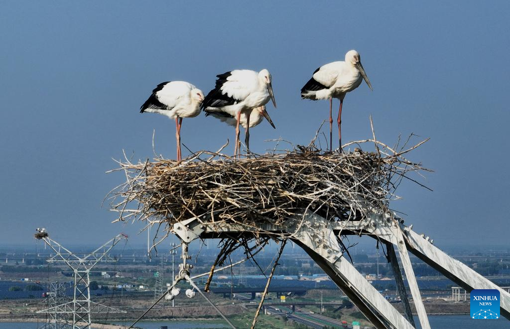 This photo taken with a drone on June 24, 2023 shows a full-grown oriental white stork (1st L, front) looking after its chicks in Heiyanzi Town of Fengnan District, Tangshan, north China's Hebei Province.?(Xinhua/Yang Shiyao)