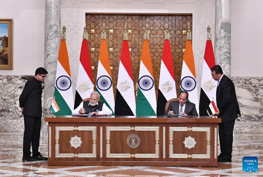 CAIRO, June 25 (Xinhua) -- Egyptian President Abdel-Fattah al-Sisi and visiting Indian Prime Minister Narendra Modi on Sunday signed a joint declaration, upgrading the bilateral relations to a strategic partnership, the Egyptian presidency announced.