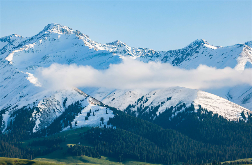 Cloud-shrouded mountains at the Narat Grasslands in Xinyuan county, northwest China's Xinjiang Uygur Autonomous Region. (Photo/Zhang Wenting)