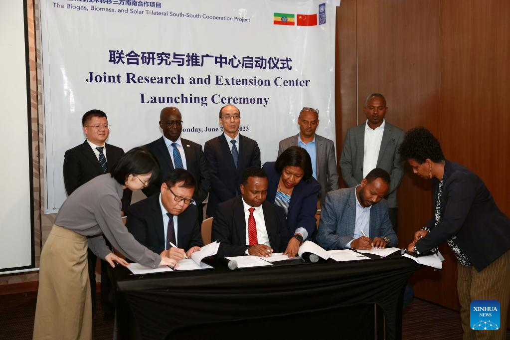 Representatives from the Ministry of Water and Energy of Ethiopia, China Agricultural University and Ethiopia's Wolaita Sodo University sign a memorandum of understanding (MoU) during a launch of the Joint Research and Extension Center in Addis Ababa, Ethiopia, on June 26, 2023. Ethiopia and China on Monday launched the joint research and extension center supported by the United Nations Development Programme (UNDP) to fast-track renewable energy development in Ethiopia. (Xinhua/Wang Ping)