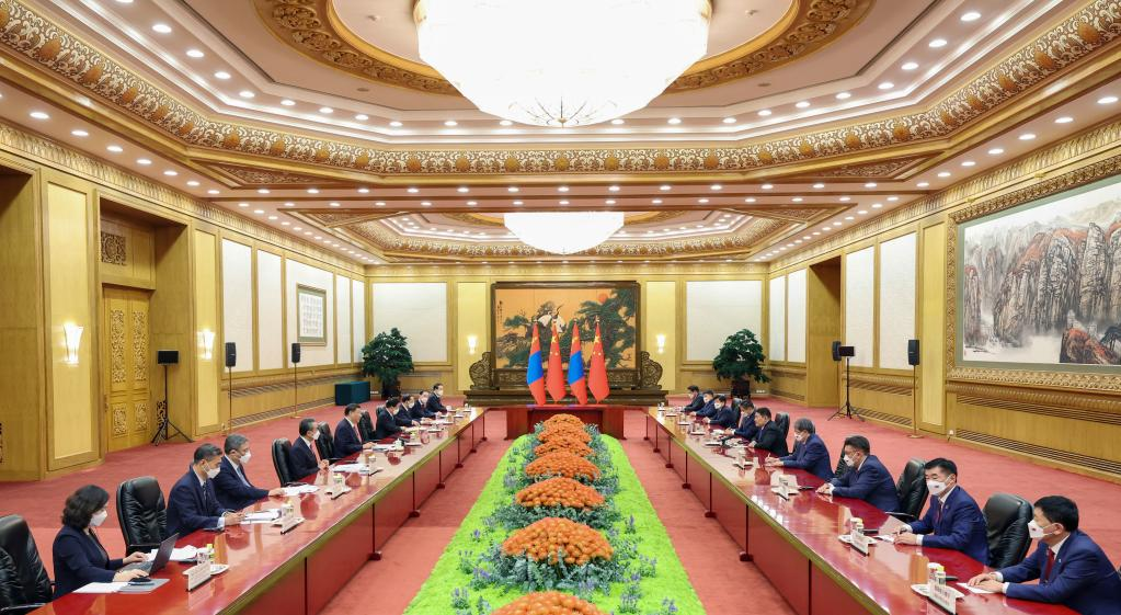 Mongolia is willing to work with China in making the Mongolia-China relations an example for relations between countries, Oyun-Erdene said. He pledged that Mongolia adheres to the one-China principle, supports China's position on Taiwan, Tibet and Xinjiang, as well as the China-proposed Global Development Initiative, Global Security Initiative, and Global Civilization Initiative.