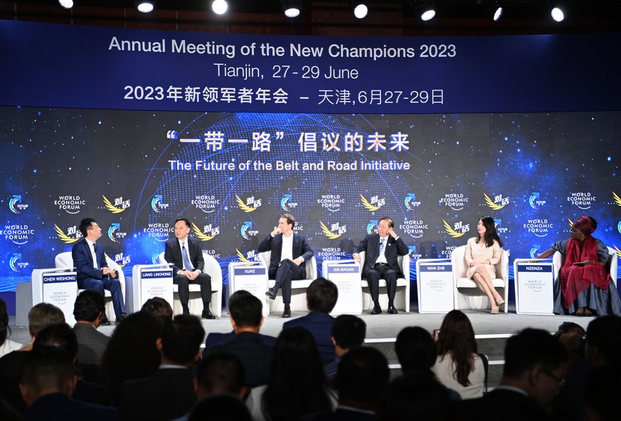 This photo taken on June 27, 2023 shows a scene of the session themed "The Future of the Belt and Road Initiative" at the 14th Annual Meeting of the New Champions, also known as the Summer Davos, in north China's Tianjin Municipality. (Xinhua/Li Ran)