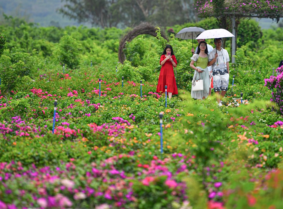 Tourists are pictured at the Hualigu cultural tourism zone in Dongfang City, south China's Hainan Province, May 1, 2023. (Xinhua/Pu Xiaoxu)