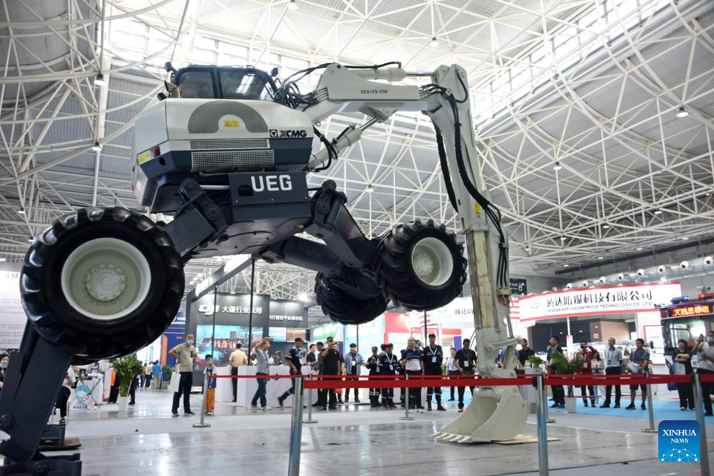 People watch an excavator stunt show at the 2023 East Asia Marine Expo in Qingdao, east China's Shandong Province, June 28, 2023.