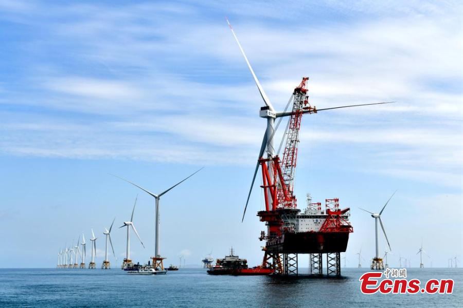 The world's first offshore wind turbine with an installed capacity of 16 megawatts is installed on Baihetan, an offshore platform with a lifting capacity of 2,000 tons, in Pingtan, east China's Fujian Province, June 28, 2023. (Photo: China News Service/Lv Ming)
