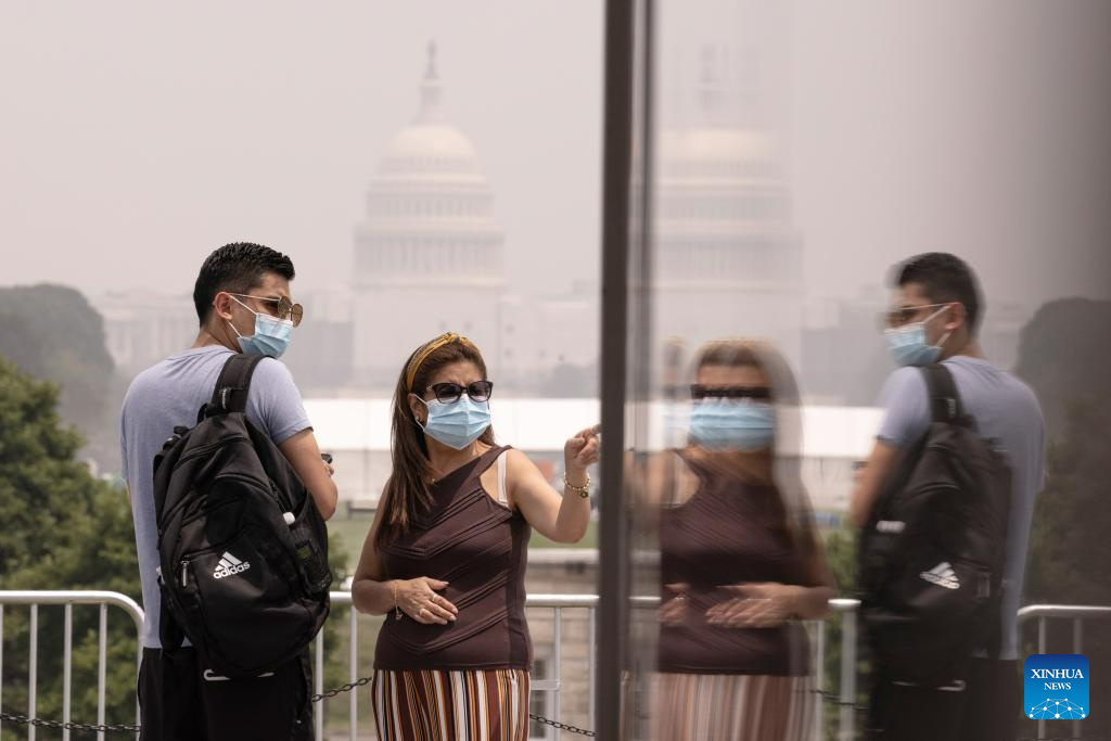 People wearing face masks are seen with the U.S. Capitol building shrouded in haze in the background in Washington, D.C., the United States, on June 29, 2023. (Photo by Aaron Schwartz/Xinhua)