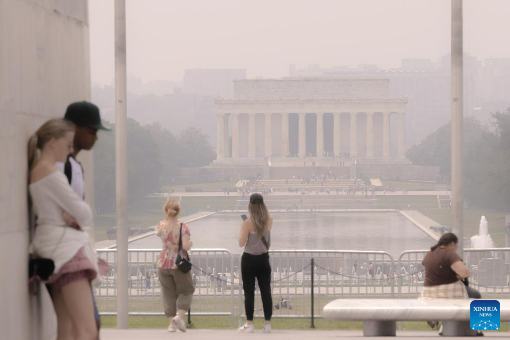 People are seen with the Lincoln Memorial shrouded in haze in the background in Washington, D.C., the United States, on June 29, 2023. (Photo by Aaron Schwartz/Xinhua)