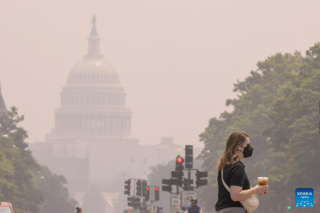 A pedestrian wearing a face mask is seen with the U.S. Capitol building shrouded in haze in the background in Washington, D.C., the United States, on June 29, 2023. (Photo by Aaron Schwartz/Xinhua)