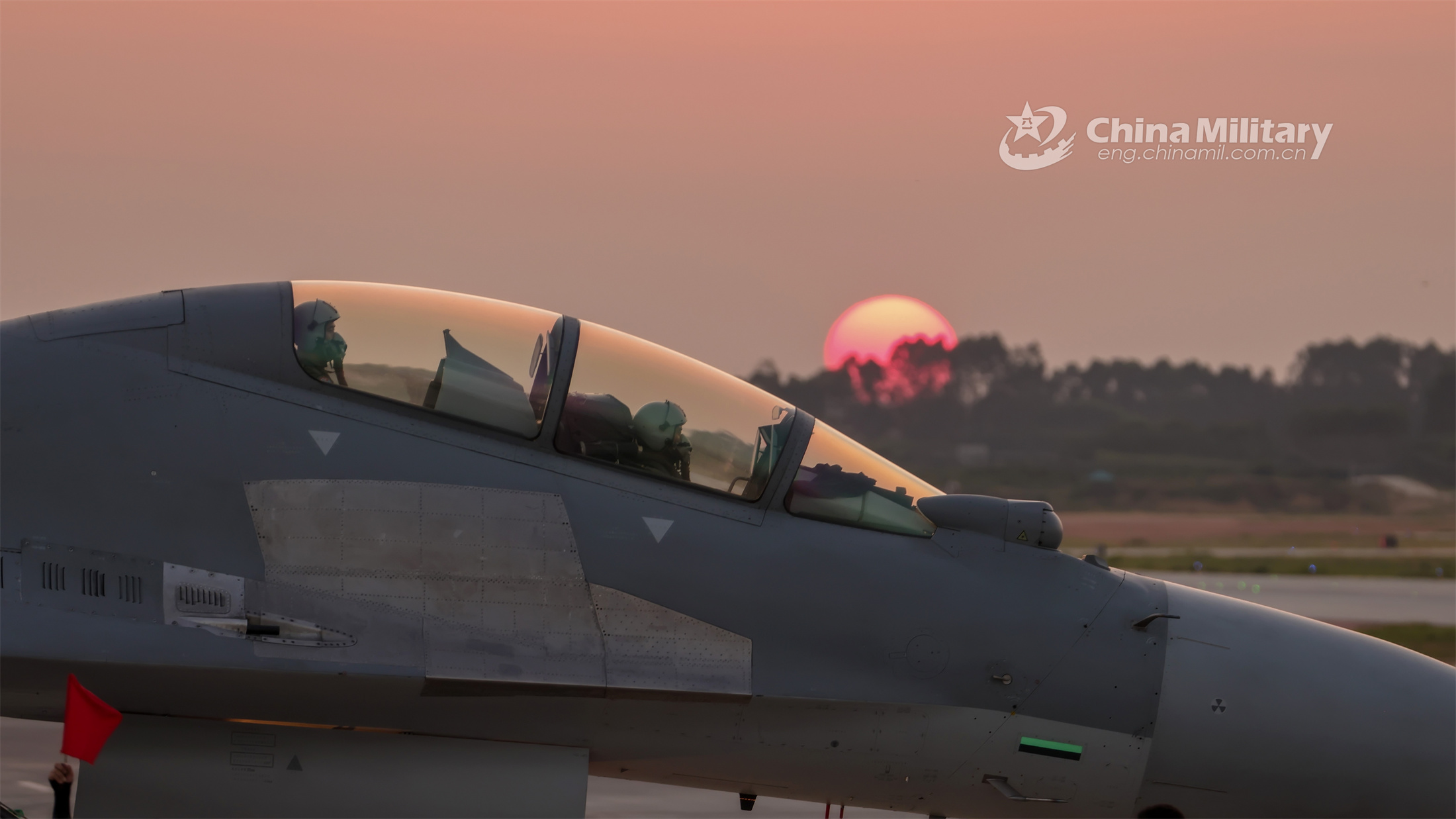 A fighter jet attached to an aviation brigade of the air force under the PLA Southern Theatre Command taxis on the runway during a round-the-clock flight training exercise in late June, 2023. (eng.chinamil.com.cn/Photo by Hao Hunan)