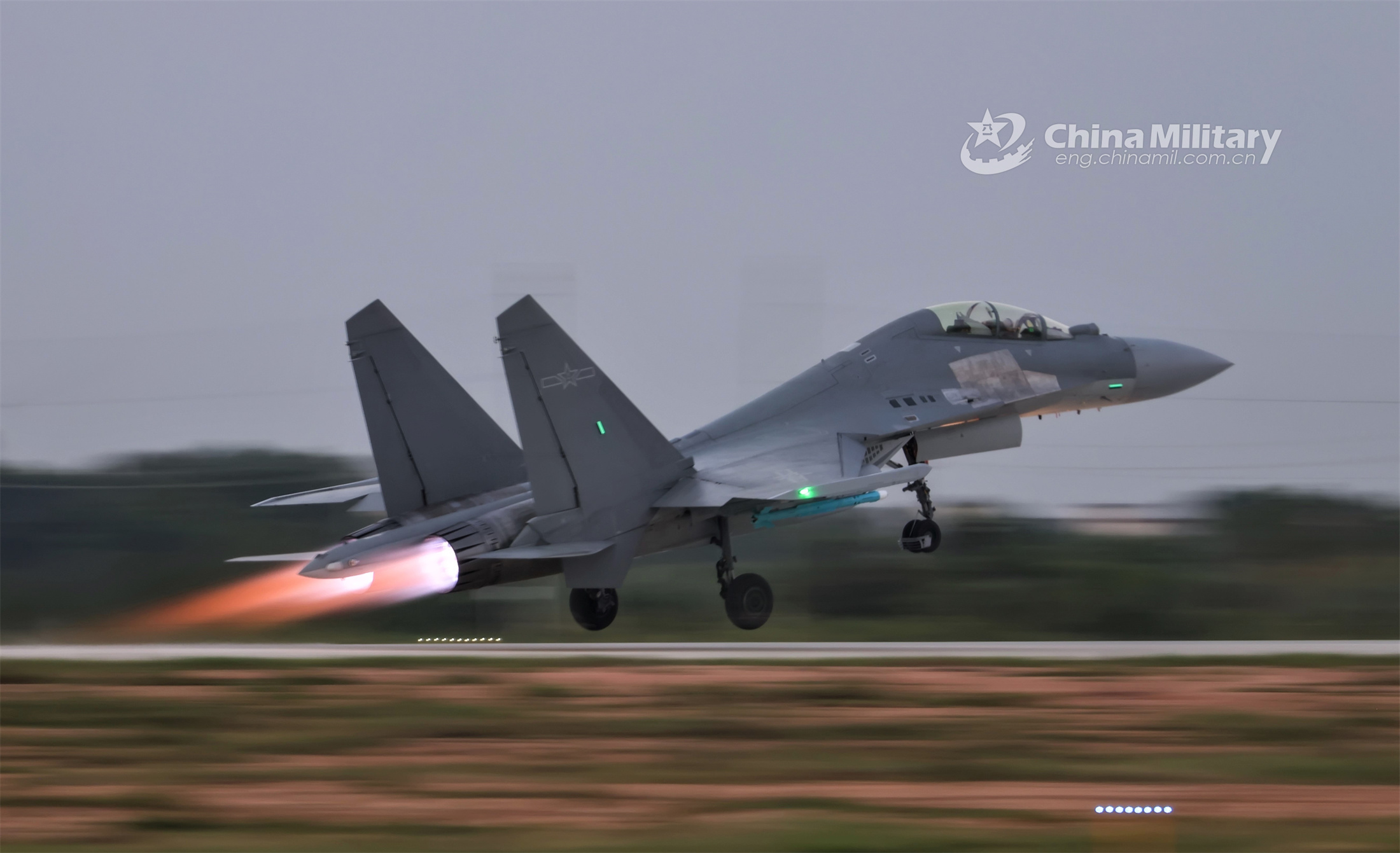 A fighter jet attached to an aviation brigade of the air force under the PLA Southern Theatre Command takes off during a round-the-clock flight training exercise in late June, 2023. (eng.chinamil.com.cn/Photo by Hao Hunan)