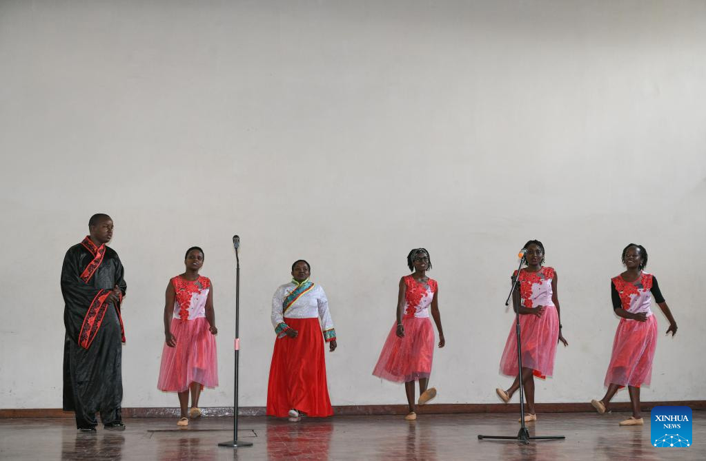 Students of the Confucius Institute of Kenyatta University perform during an unveiling ceremony for the Confucius Classroom at Starehe Boys' Center and School in Nairobi, Kenya, on June 30, 2023. A Confucius Classroom was launched on Friday at Starehe Boys' Center and School in downtown Nairobi to facilitate the teaching of Chinese language to teenage learners. (Xinhua/Han Xu)