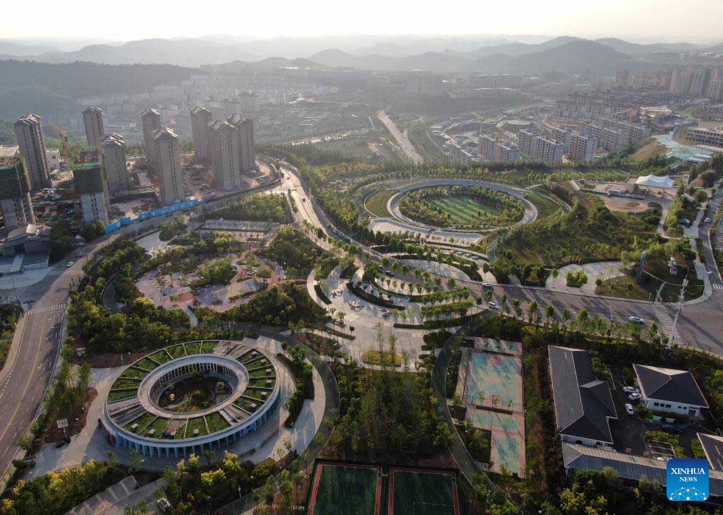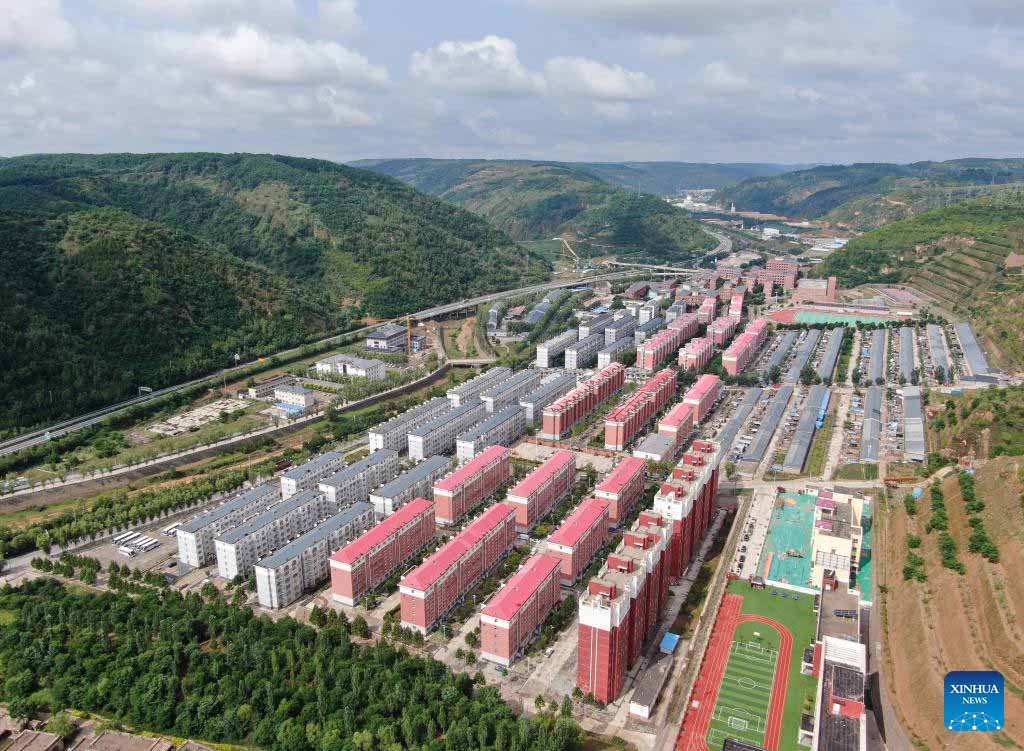 This aerial photo taken on June 28, 2023 shows a relocation residence compound where some Liangjiahe Village residents moved in at Wen'anyi Township of Yanchuan County in Yan'an City, northwest China's Shaanxi Province. The towering Baota Mountain and rolling Yanhe River have witnessed the development of Yan'an, an old revolutionary base on the Loess Plateau of northwest China. These photos present the new cityscape of Yan'an in the occasion of the 102nd anniversary of the founding of the Communist Party of China (CPC). (Xinhua/Zhang Bowen)