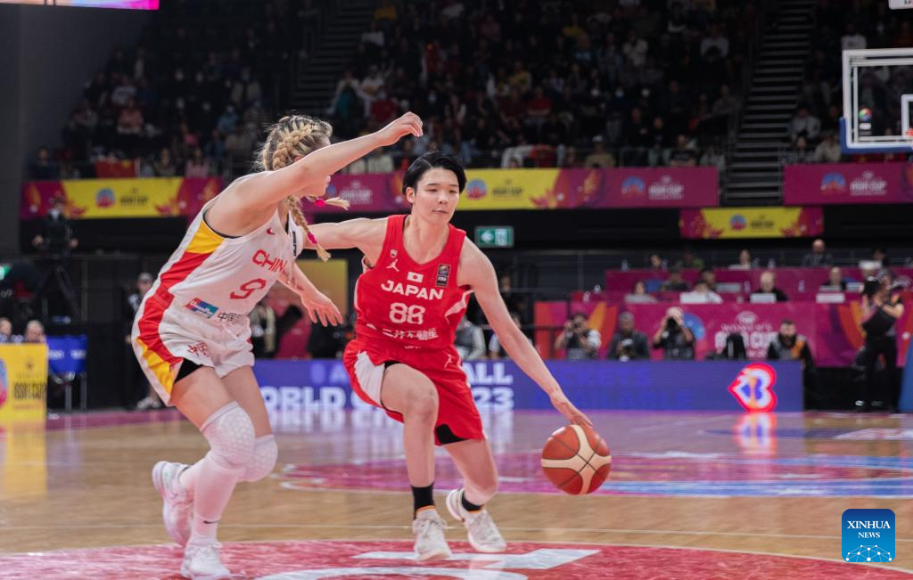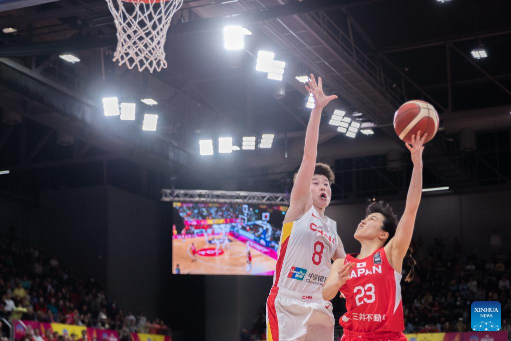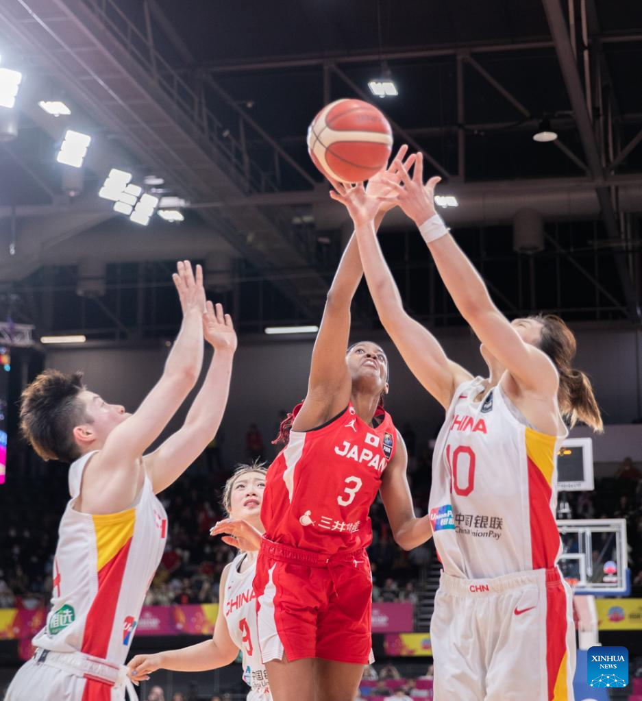Han Xu (R) of China vies with Takada Maki (2nd L) of Japan during the final of the 2023 FIBA Women's Asia Cup in Sydney, Australia, July 2, 2023. (Photo by Hu Jingchen/Xinhua)