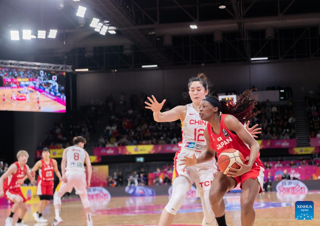 Zhang Ru (R) of China vies with Stephanie Mawuli of Japan during the final of the 2023 FIBA Women's Asia Cup in Sydney, Australia, July 2, 2023. (Photo by Hu Jingchen/Xinhua)