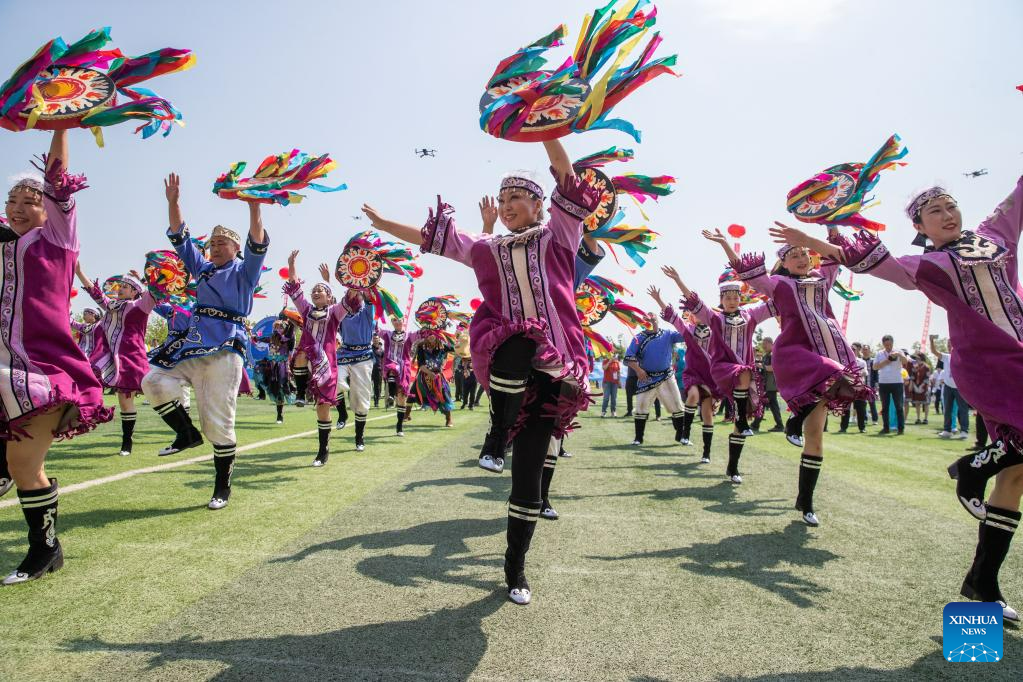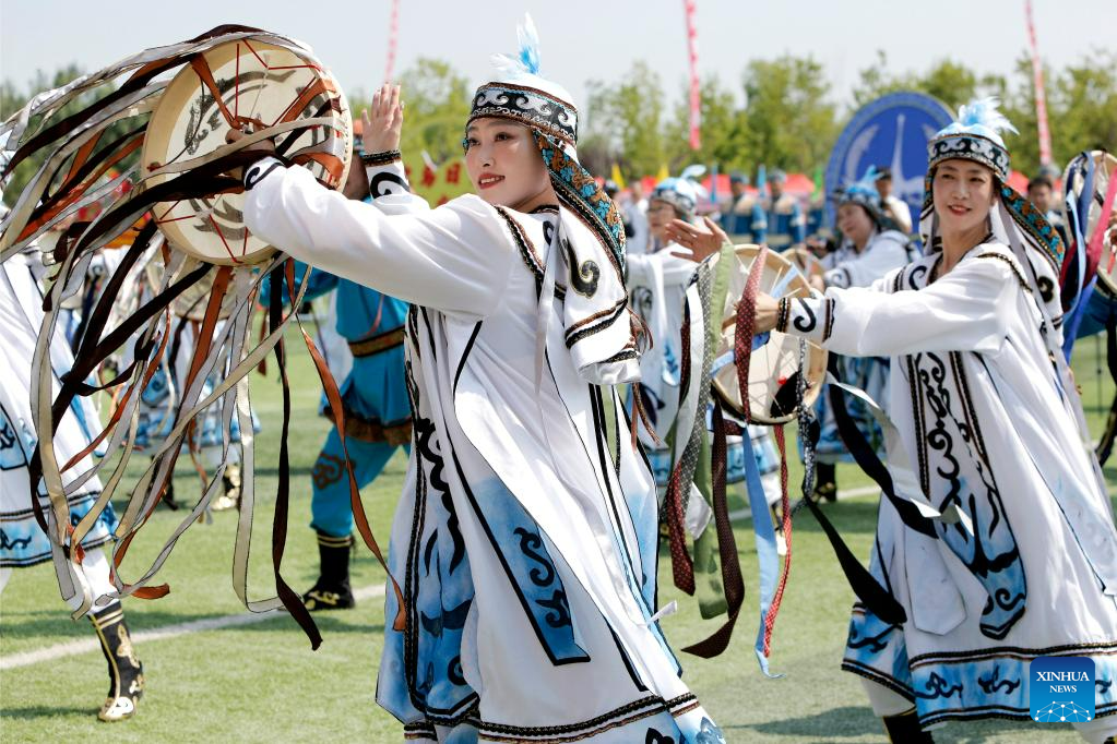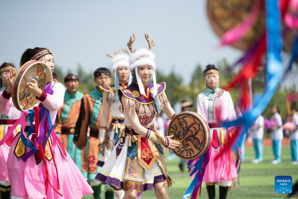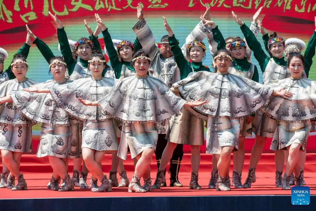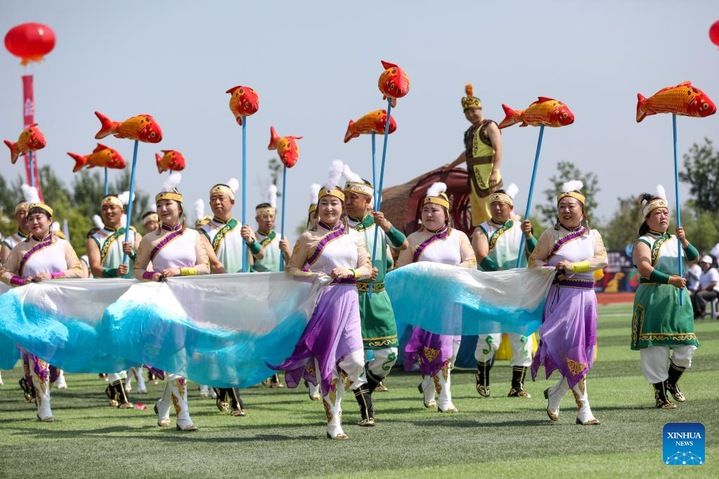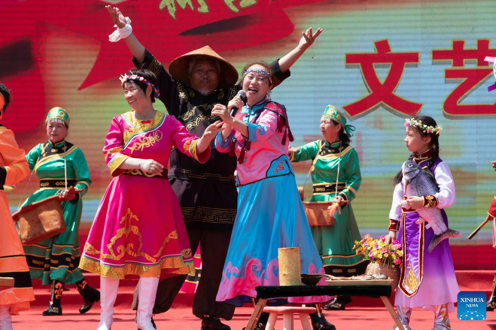 Hezhe people wearing traditional costumes perform during the 11th Wurigong Festival of the Hezhe ethnic group in Fuyuan, northeast China's Heilongjiang Province, July 2, 2023. (Xinhua/Shi Feng)
