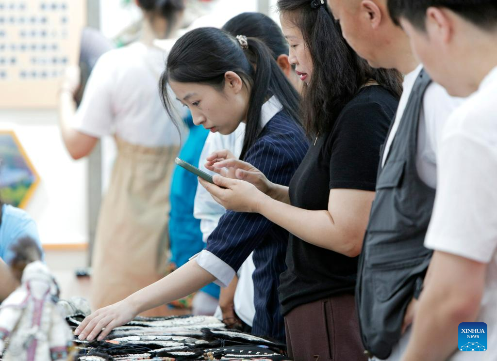 Tourists look at fish-skin ornaments during the 11th Wurigong Festival of the Hezhe ethnic group in Fuyuan, northeast China's Heilongjiang Province, July 2, 2023. The festival kicked off in China's easternmost city Fuyuan on Sunday. (Xinhua/Shi Feng)